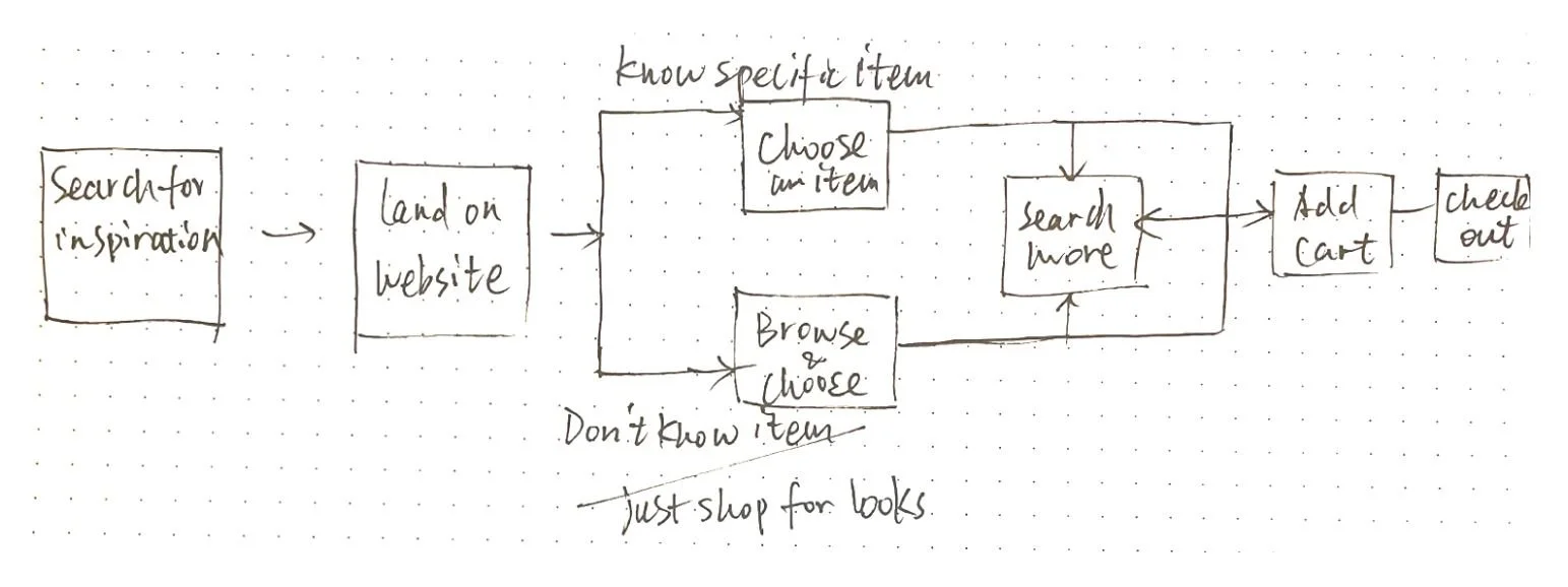 After reading into user statements, interviews, and research insights, I concluded users (shoppers) generally follow a similar process below when searching for home décor items.