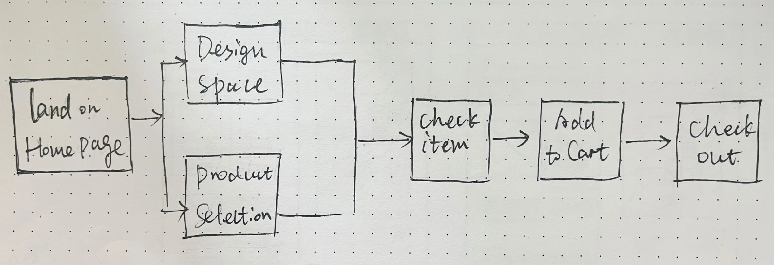 I followed the shopper’s primary flow to wireframe: landing on home page -> go to either “Design Space” or “Product Selection” -> check an item -> add to cart -> checkout.