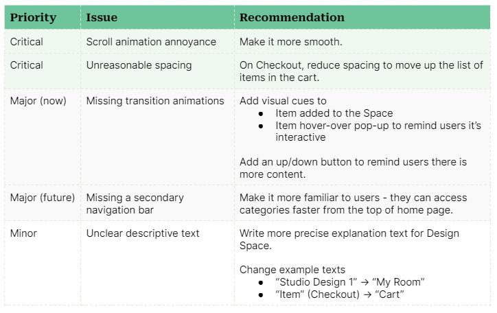 Testers gave pretty positive feedback on the new features regarding the usefulness and clean design. They all mentioned that the general shopping experience feels easy and intuitive, and most showed a strong interest and preference for Design Space.